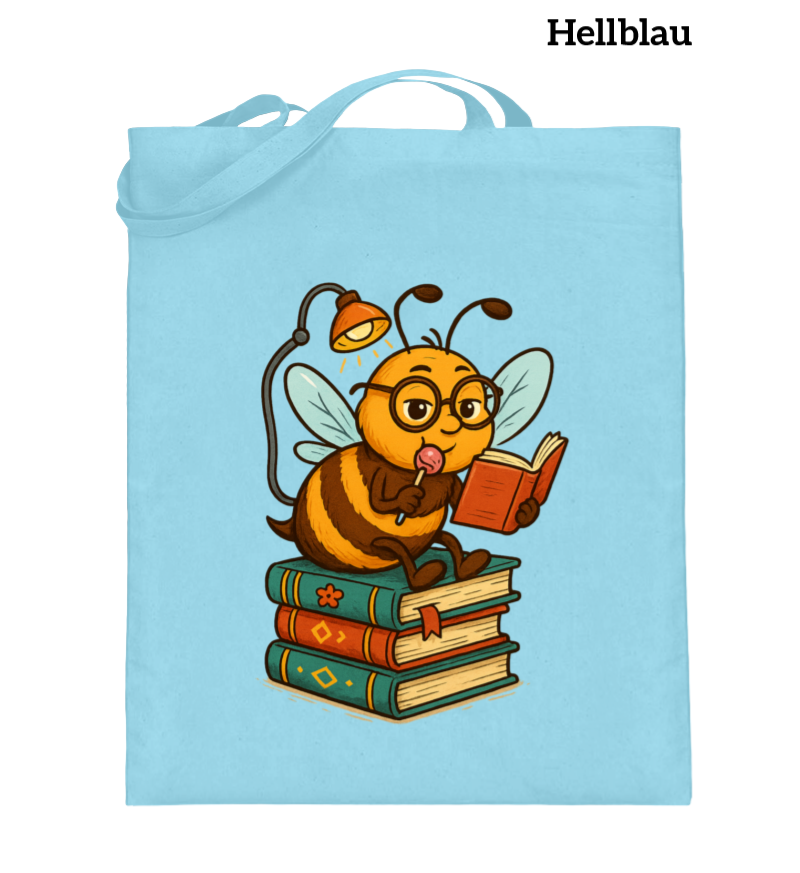 Mit der niedlichen Lesebiene auf einem Bücherstapel wird jeder Bibliotheksbesuch zum Highlight. Egal ob Roman, Ratgeber oder ein Glas Honig vom Markt – dieser Beutel trägt alles mit Stil und Herz. 🍯💛