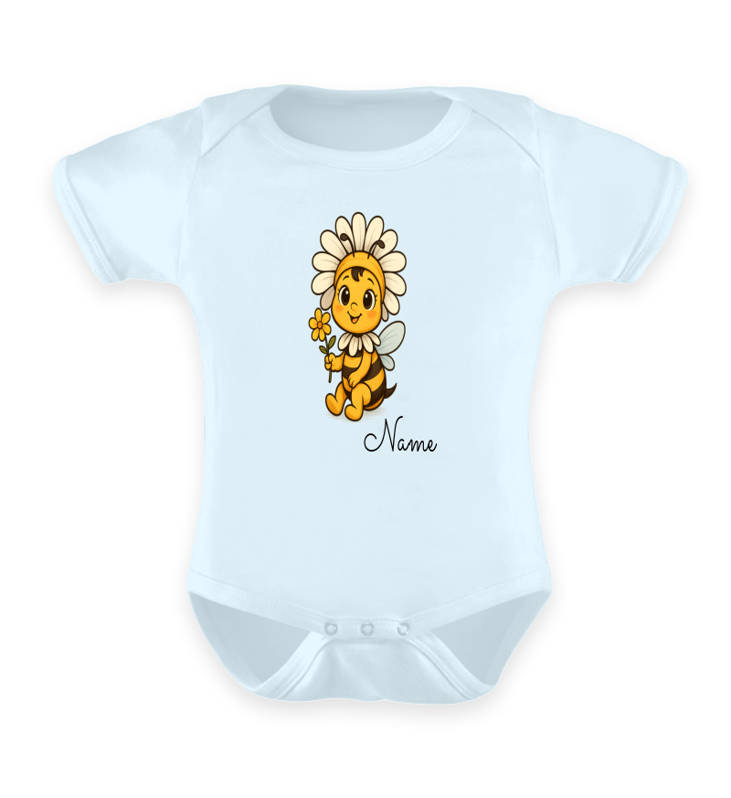 Baby-Body in Rot, Rosa, Blau oder Grau, mit einer niedlichen Biene, die eine Blume hält. Auf Wunsch personalisierbar mit dem Namen des Babys.